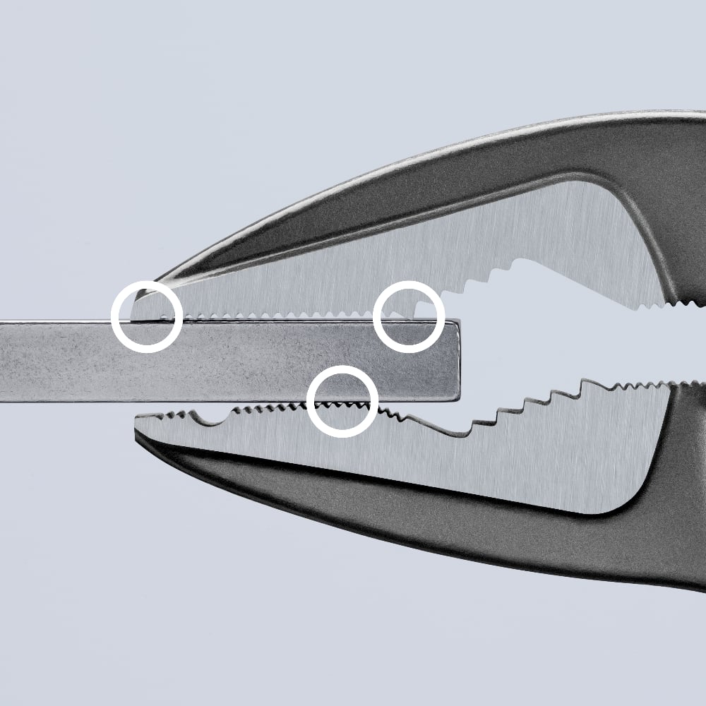 • Long, narrow jaws with front gripping serration: longitudinal gripping profile for round parts such as screws and bolts