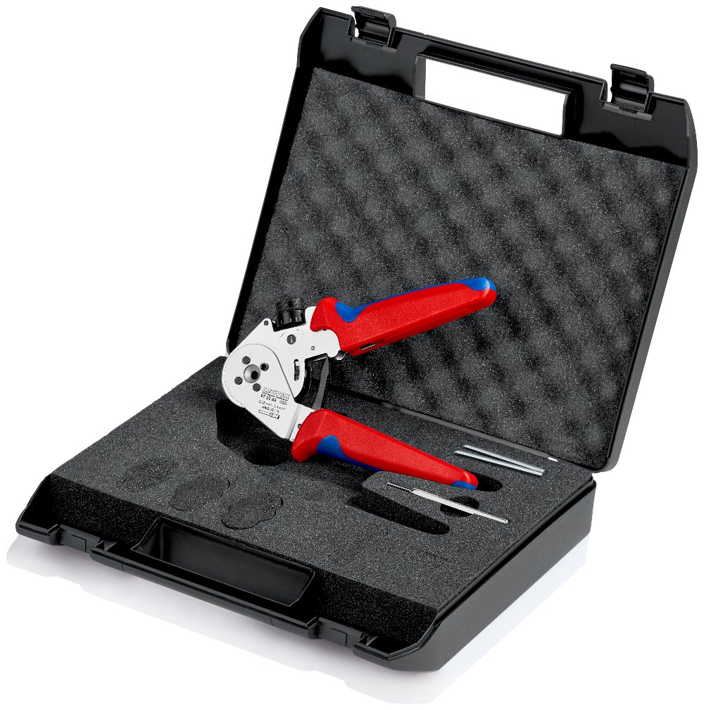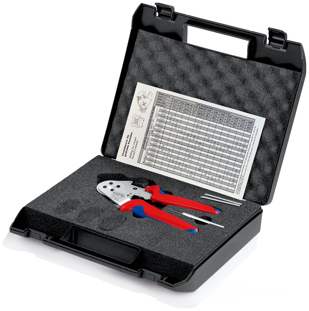 • Pliers in a plastic case with foam insert and standard locator for precise positioning of the contacts