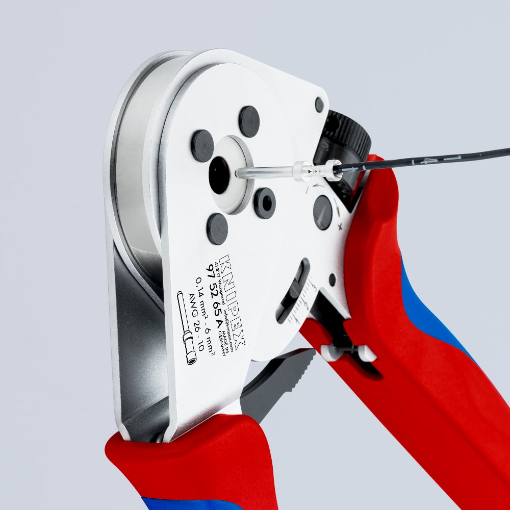 • Basic pliers without locator for crimping turned pin and socket contacts from various contact manufacturers, for cable cross-sections from 0.14 to 6 mm²