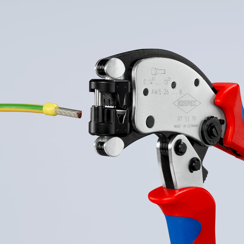 • Crimp opening accessible from both sides, a length of up to 18 mm can be crimped in one operation, extra-long wire ferrules can be fed in